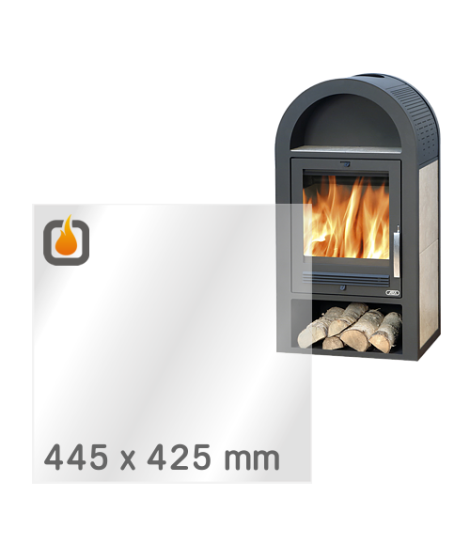 Das Glas hat die Maße 445 x 425 mm und eine Dicke von 4 mm. Es ist klar, beidseitig identisch und ideal als Ersatz für das originale Sichtglas Ihres Kaminofens.