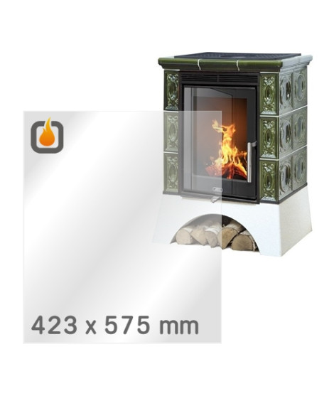 Das Glas hat die Maße 423 x 575 mm und eine Dicke von 4 mm. Es ist klar, beidseitig identisch und ideal als Ersatz für das originale Sichtglas Ihres Kaminofens.