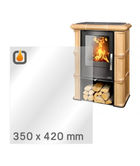 Das Glas hat die Maße 350 x 420 mm und eine Dicke von 4 mm. Es ist klar, beidseitig identisch und ideal als Ersatz für das originale Sichtglas Ihres Kaminofens.