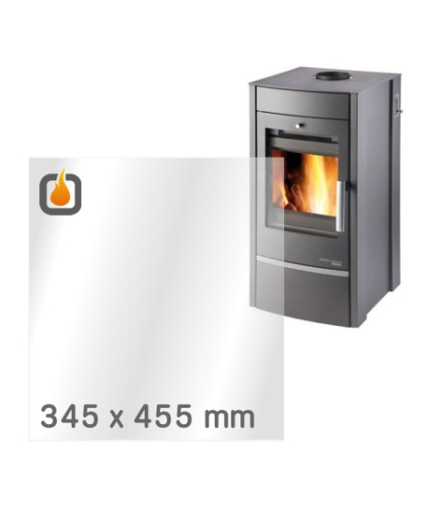 Das Glas hat die Maße 345 x 455 mm und eine Dicke von 4 mm. Es ist klar, beidseitig identisch und ideal als Ersatz für das originale Sichtglas Ihres Kaminofens.