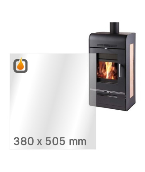 Das Glas hat die Maße 380 x 505 mm und eine Dicke von 4 mm. Es ist klar, beidseitig identisch und ideal als Ersatz für das originale Sichtglas Ihres Kaminofens.