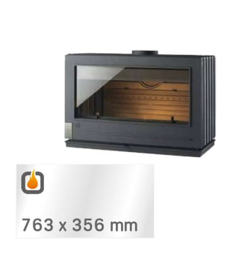 Das Glas hat die Maße 763 x 356 mm und eine Dicke von 4 mm. Es ist klar, beidseitig identisch und ideal als Ersatz für das originale Sichtglas Ihres Kaminofens.