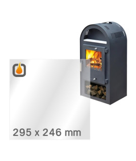 Das Glas hat die Maße 295 x 246 mm und eine Dicke von 4 mm. Es ist klar, beidseitig identisch und ideal als Ersatz für das originale Sichtglas Ihres Kaminofens.